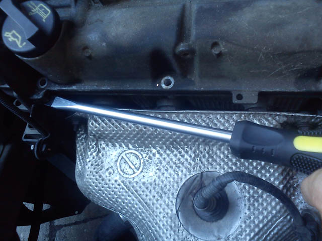 7. Podważanie pokrywy należy zacząć ostrożnie, w najmocniejszych miejscach, np. przy wlewie oleju jest grube "ucho", tam można rozpocząć, później "po przekątnej". Pokrywa lubi się "zapiekać", czy "sklejać" do głowicy, całkiem początkujący mogą być przestraszeni, zdarzały się na forum tematy typu "odkręciłem wszystkie śruby, a pokrywa ani drgnie". Szarpanie ręką za całą pokrywę nic nie da przeważnie, trzeba właśnie napocząć, "zerwać" ją punktowo. Oczywiście nie można pokaleczyć powierzchni uszczelniających pokrywa-głowica. Załącznik: