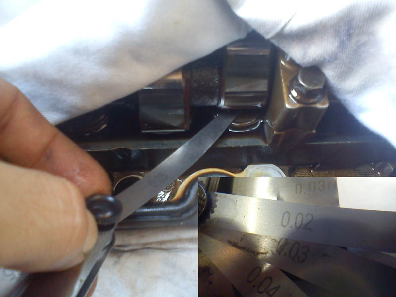 11. W końcu zbliżamy się do celu całej akcji (sprawdzenie i regulacja luzu). Czynność jest banalna (obracamy wałek krzywką do góry, wtedy między wałkiem, a płytką zaworu pojawia się luz, który mierzymy). Od biedy można korzystać tylko z zestawu szczelinomierzy stopniowanych co 5 "setek" (0,05 mm), ale lepiej się wspomagać cieńszymi listkami (są np. szczelinomierze od 0,02 mm co setkę). Różnicę 1-2 "setek" już czuć (cieńszy stos wchodzi na styk, a grubszy już nie chce, listki się klinują albo cienkie zwijają, wyginają). Wartości luzów w całej rodzinie FIRE od lat są podobne (a czasami te same), tutaj ma być: 0,30 mm na ssaniu (dolot) oraz 0,40 mm na wydechowcyh (więcej, bo się bardziej grzeją i luz bardziej maleje w trakcie pracy). W mechanice zawsze jest tolerancja. Nawet jak nie podają. Standardowo odchyłka może wynosić 0,05 mm w obie strony (z dwojga złego lepiej luz za duży, niż za mały, zwłaszcza na wydechu, a szczególnie przy LPG). Załącznik: