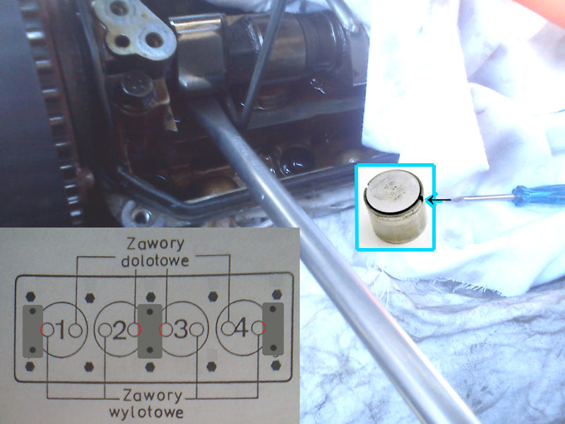 -------------------------- EDIT 1 ------------------------------- Zabrakło ważnej uwagi: przedział płytek 2,00-2,20 mm, to jest już raczej ostatnia regulacja (później remont głowicy ewentualnie "rzeźba" typu szlif trzonków zaworów), bo takie płytki już prawie nie wystają ze szklanek, niedługo wałek zacznie zawadzać o krawędź szklanki. Zwracać na to uwagę przy regulacji w tym zakresie, przyjrzeć się, plus po jeździe próbnej zdjąć pokrywę jeszcze raz (za drugim razem to zajmuje 10-15 minut, np. komputerka nie trzeba zdejmować, ani rozpinać wtyczek, odkręcić całość komputerek wraz z podstawką/mocowaniem, czujnika faz nie trzeba wyciągać, osłony rozrządu też, tylko śruby wykręcić). Załącznik: