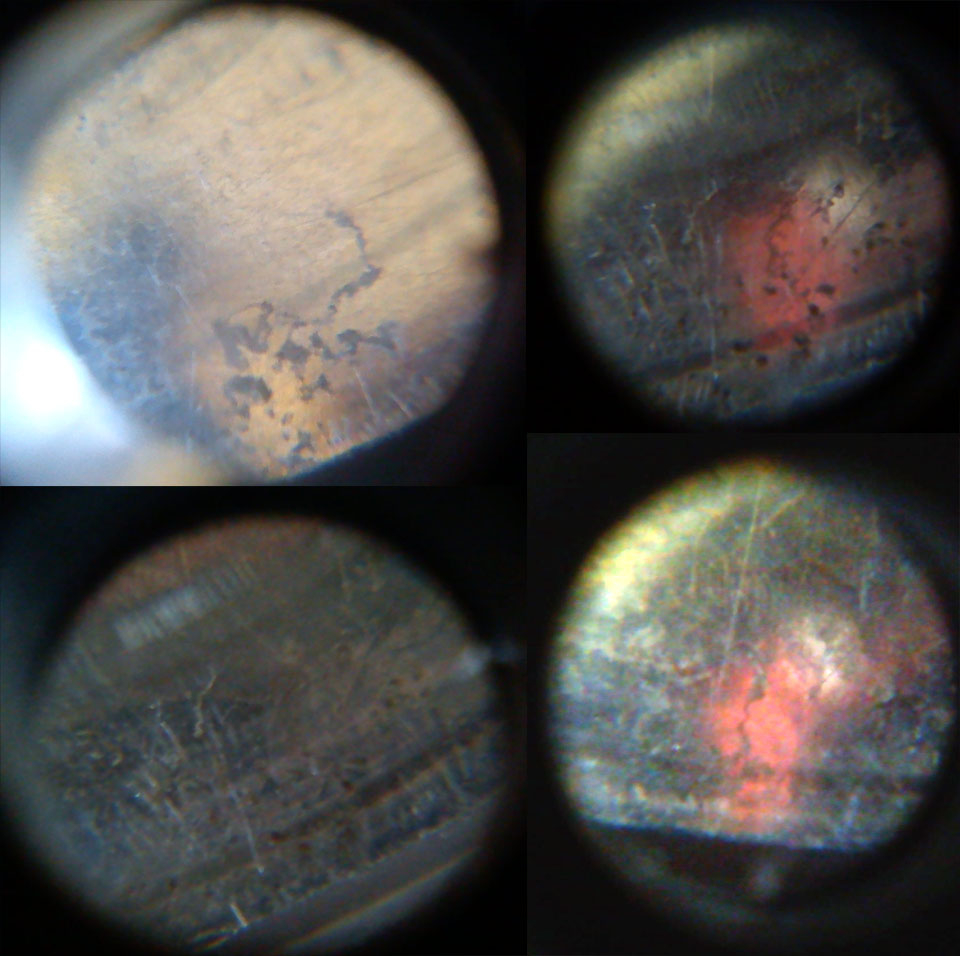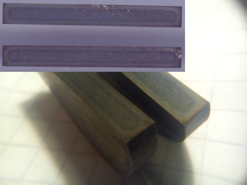 Test, jak wcześniej, przełom/cięcie, szlif, polerka, wytrawianie. Widać różnicę warstw. Płytka handlowa miała 2,30 mm, szlify były tylko o kilka setek, ale już widać, że powierzchnia utwardzana jest cieńsza (po prawej, albo na górze, zależy jak się obrazek wyświetli, pionowo/poziomo). Załącznik: