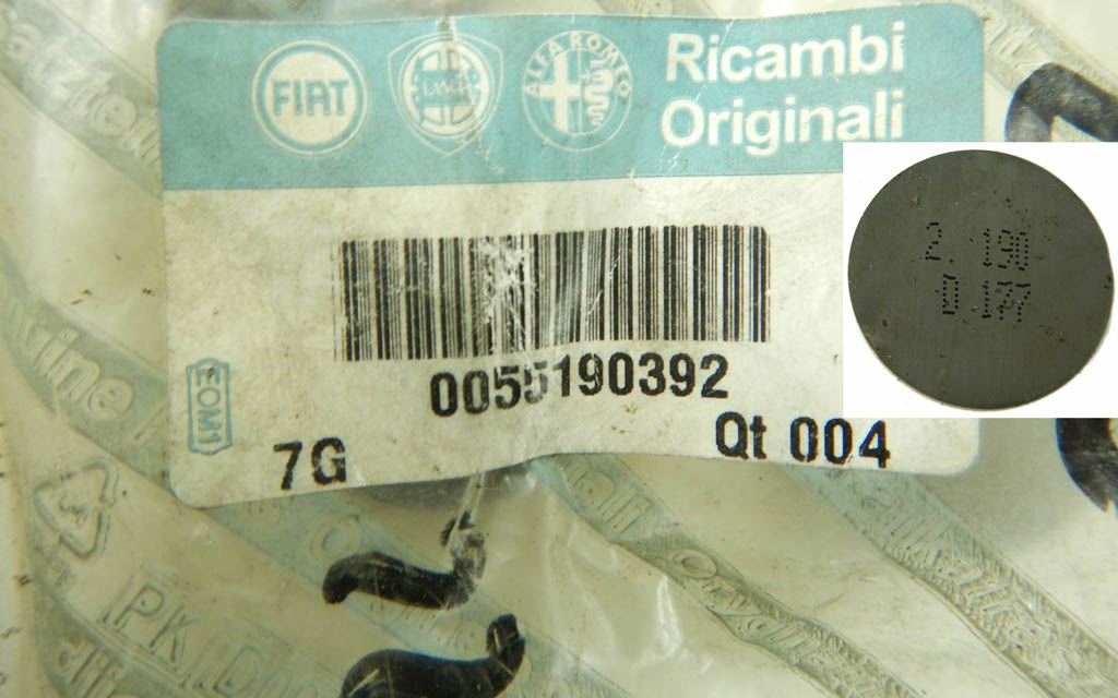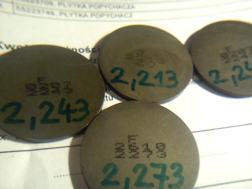 Czyli można dać 3 płytki 2,20 w miejsce obliczonych 2,21/22/23 oraz jedną 2,25 jako wyliczone 2,27. To znaczy z dwojga złego idziemy z tolerancją luzu "na plus" (większy luz = "za cienka" płytka). Wadą może być głośniejsza praca rozrządu (szczególnie na zimno), więc to też takie dobre nie jest. W sytuacji podbramkowej, klęska żywiołowa, koniec świata, itp., można by dokonać podmiany istniejących płytek z wydechu cylindra 4 na drugi (czyli wyjąć 2,333 i wstawić w miejsce obliczonego 2,268, luz byłby wtedy za ciasny o jakieś 6 setek). 16. Zakres grubości płytek w nowych Fiatach poszedł w dół (2-3 mm), średnica została. Starsze modele miały grubsze płytki (3-4 do 5 mm nawet), rynek jest obecnie zalany nimi, grubymi (można kupić wszystkie wymiary, hurtowo, w detalu, nowe, używane - dla nas, do Grande, są niestety bezużyteczne). Cienkich płytek prawie że brak. Jak ktoś zna przyczynę tej patologii, to niech napisze. Załącznik: