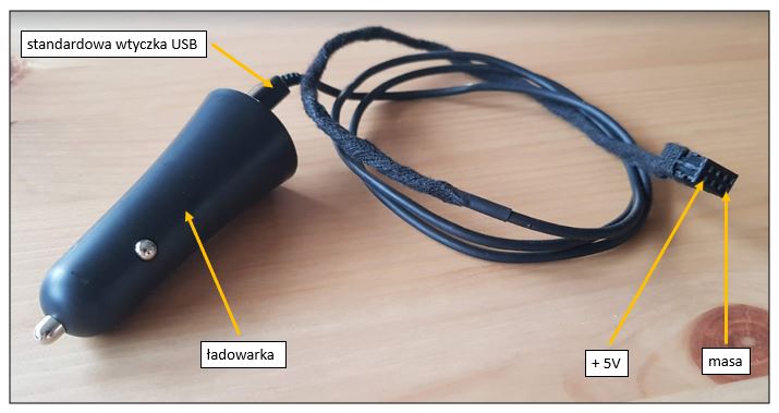 Ponieważ zasilanie ładowarki jest przez kabel USB z 3 amperowej ładowarki potrzebujemy jeszcze kabel z gniazdem ładowarki samochodowej. Oczywiście plus na środek gniazda, a masa na bok. Podpinamy go równolegle do gniazda zapalniczki lub w inne miejsce gdzie pojawia się +12V po zapłonie zabezpieczając bezpiecznikiem min. 3A.