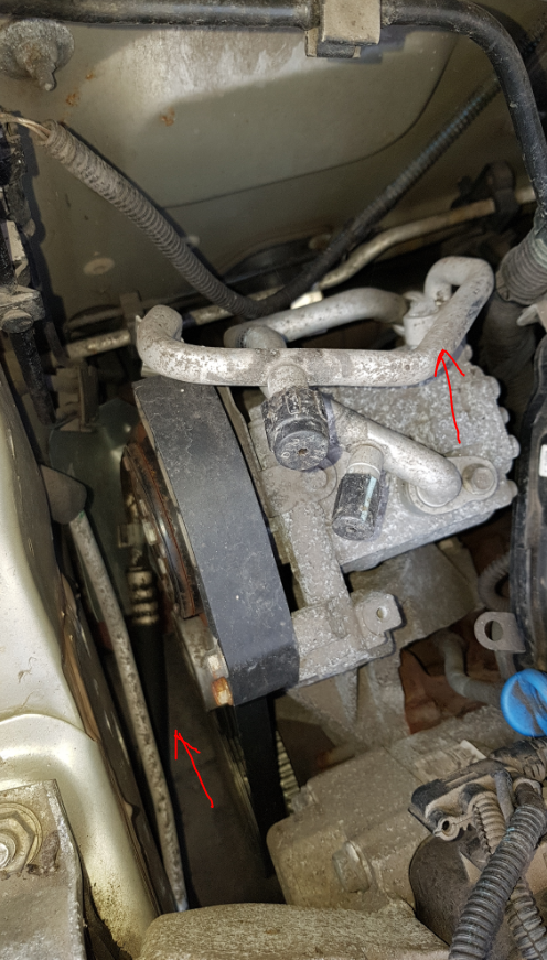 Fiat Punto 2 Classic 2010r. FL. Cały czynnik klimatyzacji uciekł. Wąż idący przy podłużnicy obok paska klinowego do chłodnicy z kompresora wskazany na zdjęciach na części gumowej jest tłusty do połowy. Byłem w serwisie i wzorokowo wskazali go, że na 100% ma nieszczelność.