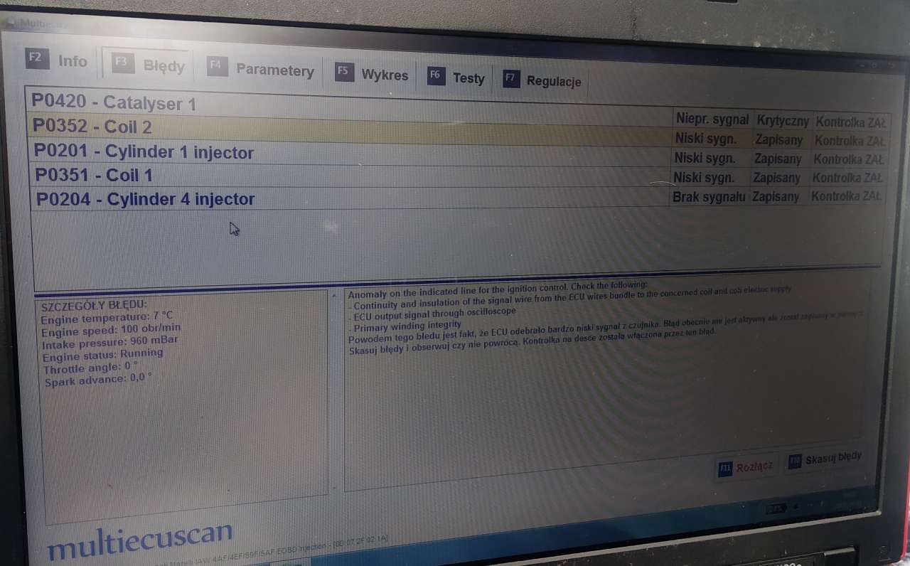 Koledzy, dziękuję za odzew i zainteresowanie wątkiem. Więc tak... Rozebrałem zegary, "dioda od silnika" była zalepiona (zdjęcie w załączeniu). Auto kupione od prywatnego właściciela, starszy (wydawało się) SYMPATYCZNY Pan - jak się okazało hoooooj Kontrolka silnika oczywiście świeciła cały czas (była po prostu zalepiona). Teraz tak, byłem na komputerze i są następujące błędy: P0420 - Catalyser 1 P0352 - Coil 2 P0201 - Cylinder 1 injector P0351 - Coil 1 P0204 - Cylinder 4 injector Wymieniać cewki, kable i świece? Czy błędy mówią o czymś jeszcze? Dodam, że błędy zostały wykasowane i póki co kontrolka zapala się na zapłonie i gaśnie z chwilą uruchomienia silnika (ale przedtem trzęsienie silnika również występowało co jakiś czas, a nie zawsze/za każdym razem).