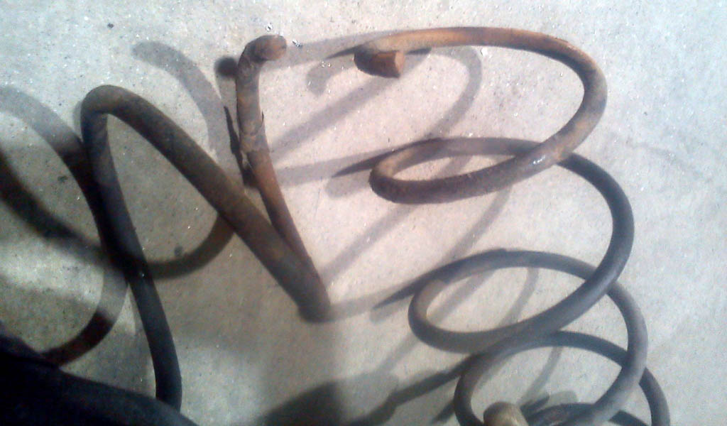6. Także korozja powierzchniowa sprężyn, zignorowana, tak się może skończyć za rok, dwa, trzy. To lekki przypadek (strzeliły równo obie tak samo, na końcówkach, nawet nie wiem kiedy, nic nie było czuć, ani słychać). Sprężyny mogą trzasnąć np. w połowie, wyskoczyć z talerza i wbić się w oponę w trakcie jazdy (wtedy masakra).