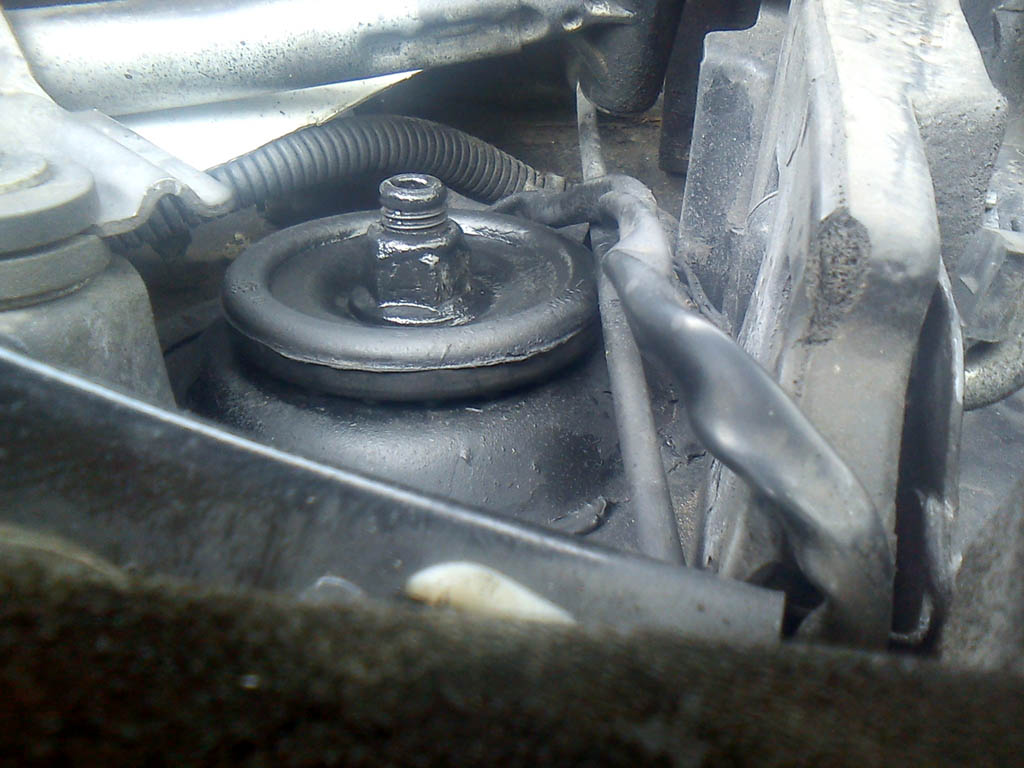 4. Kolumnę trzyma nakrętka od góry (talerzyk na kielichu) i dwie śruby przy zwrotnicy. Wcześniej odpinamy od amora łącznik stabilizatora, odczepiamy przewód ABS i wężyk od hamulca. Tyle. Fotka archiwalna (od razu sugeruje co będzie dalej źle).