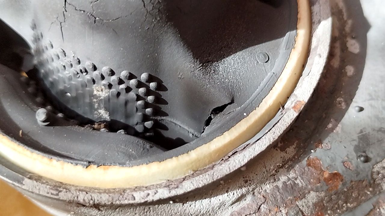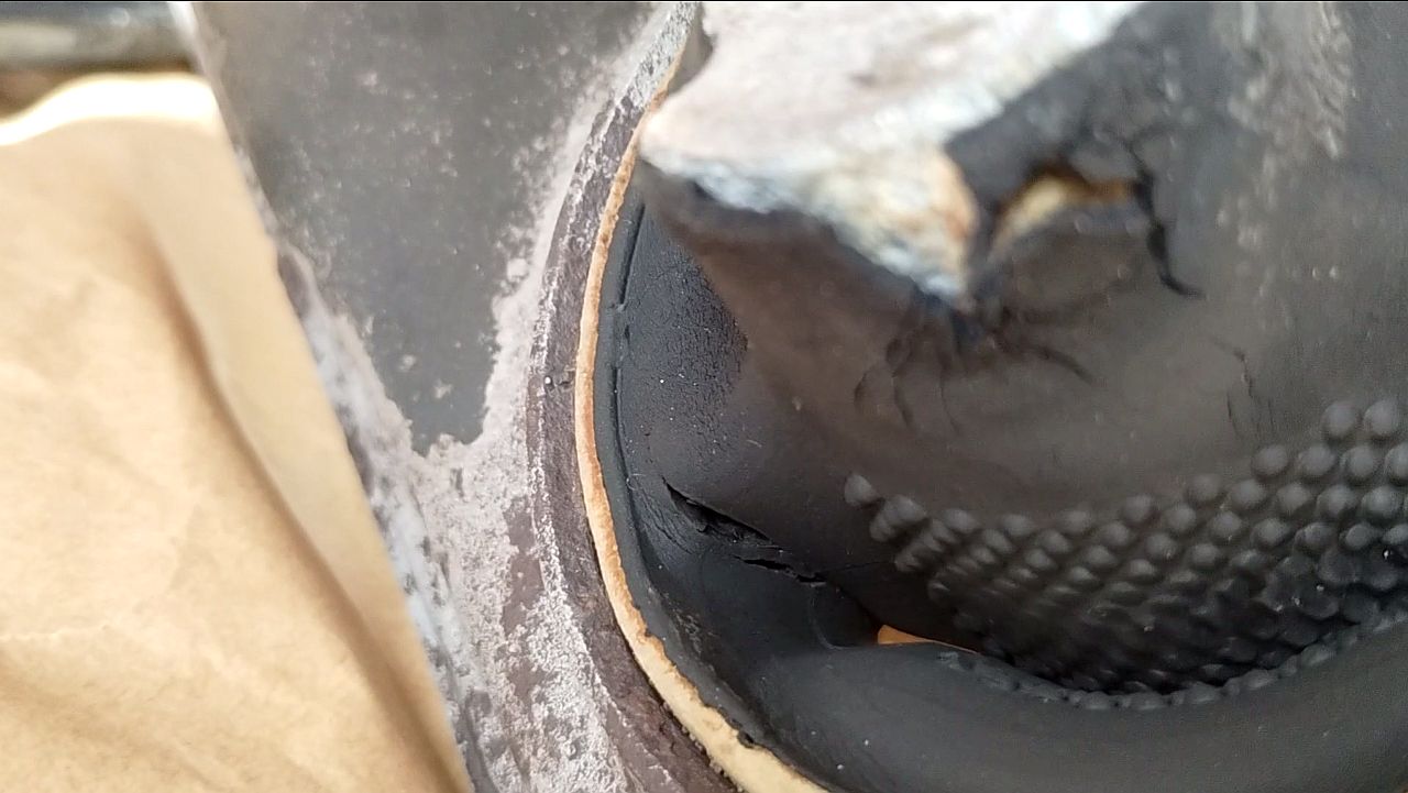 Powód drugi, powierzchniowe pęknięcia ("pajęczynka") po demontażu i umyciu gum (trochę też piaskowanie otworzyło) okazały się głębokimi pęknięciami. Gumy się rwą. Lekcja dotyczy KAŻDEJ gumy w samochodzie: na brudnym i zamontowanym elemencie często nie widać rozmiaru zniszczeń. Tu się niekumaci najmocniej kłócą w razie problemów (że "ja mam dobre", mocowania silnika, wahacze, belkę tylną itd., "bo nie jest całkiem zerwana" guma).