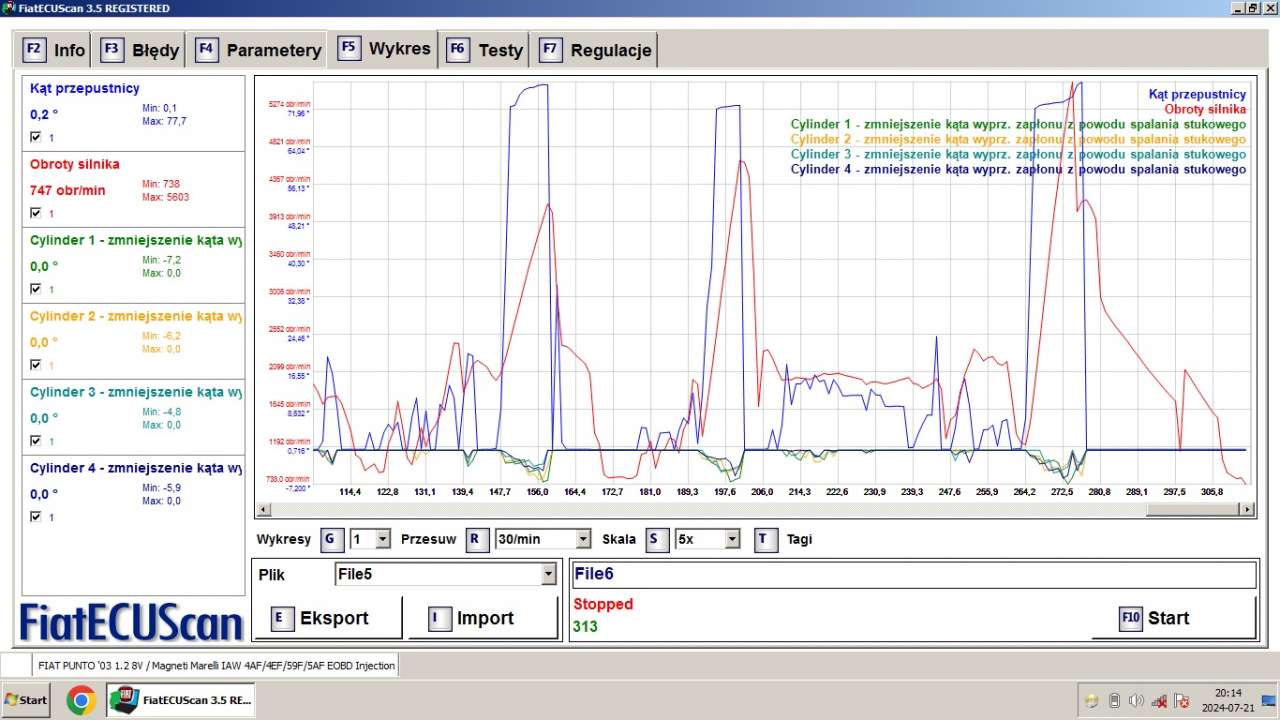 Jeśli chodzi o spalanie stukowe walczę z tym od jakiegoś czasu, chyba zaczęło się w tamtym roku ale sporadycznie i tylko przy mocno rozgrzanym silniku. Obecnie bardzo się nasiliło w upały, jest to mocno słyszalne jak ruszam z odpaloną klimatyzacją, takie charakterystyczne stukanie jakby młotkiem uderzył o blok silnika, ale takie głuchawe  zakres stukania 1200-2000 obr przy średnim obciążeniu, ALE co ważne jak przy tych obrotach wcisnę pedał gazu w podłogę stukanie ustaje. Dodam że jak silnik jest zimny albo mamy porę zimową pracuje idealnie, zero spalania stukowego. Co już zrobiłem: - Wymiana świec na NGK (japońskie) - Wymiana przewodów zapłonowych (Bosch) - Podmiana i rotacja cewek zapłonowych (używane oryginał) - Podmiana wtrysków z modelu 2010 rok i małym przebiegiem - Wymiana przepustnicy (używana oryginał) - Wymiana paska rozrządu i rolki napinacza (oryginał Fiat) - Sprawdzanie czy nie są zerwane kliny na kołach rozrządu, wału - Czyszczenie czujników wału i wałka - Sprawdzanie wydechu (jest minimalne pęknięcie na katalizatorze, słychać to na zimnym) - Wymiana sondy lambda (oryginał bosch) - Olej Valveline 5W40 - Płyn chłodniczy (oryginał Paraflu UP) - Sprawdzanie UPG, nie ma CO2 w u płynie układzie chłodzenia I chyba tyle, ogólnie po za tym Punciak nie pobiera oleju, jeździ sprawnie i bardzo mało pali. Tylko to spalanie stukowe zabiera całą przyjemność z jazdy, aż czasami strach jechać gdzieś dalej. Jeździłem też na paliwie 98 i na tym paliwie jest wyraźnie lepiej. Dzisiaj spróbuje zmierzyć kompresję. Jeszcze jedna sprawa, jeździłem z odpalonym FiatEcuScan i sterownik potrafi bardzo mocno wycofywać zapłon, wartości rzędu -8 stopni. Załącznik: