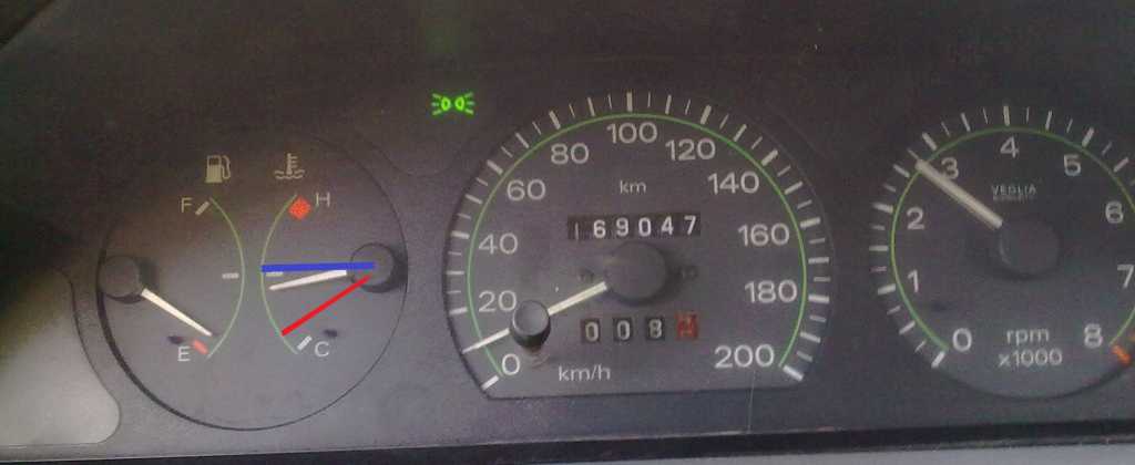 Pochwaliłem się chyba przedwcześnie rezultatem wymiany Otóż sprawa wygląda tak: podczas jazdy wskazówka stoi w miejscu ( czerwonej lini na foto) w czasie postoju stoi w miejscu jak na foto a włącza wentylator w miejscu ok ( niebieskiej lini na foto) A czy nie powinno być tak że w czasie normalnego użytkowania wskazówka powinna wskazywać ok 1/2 a powyżej włączać wentylator. Irytuje mnie głównie wskazanie podczas jazdy ( czerwona linia na foto) Czy da się coś z tym zrobić?