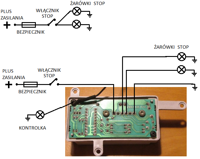 Na górze widać schemat instalacji w aucie, gdzie kontrolka świateł stop nie jest podłączona.