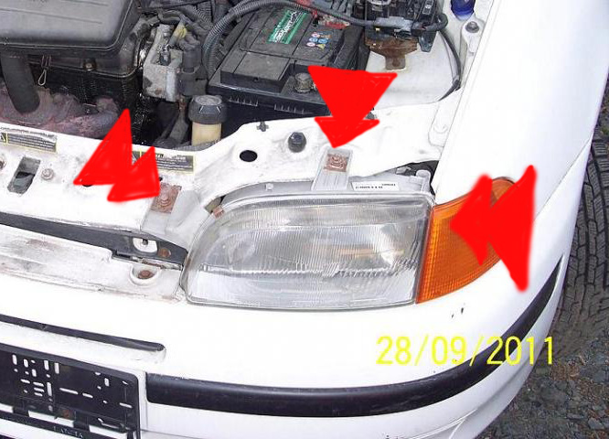 Przeróbka przednich lamp na a'la GT/Sporting w mk I Witam szanowne zgromadzenie, opiszę co trzeba zrobić żeby mieć bajeranckie lampy (dymione) jak oryginalnie w GT. Myk działa zarówno w lampach H1+H1 jak i w zwykłych H4. Ja opiszę na przykładzie H1+H1. Aha, nie ponoszę żadnej odpowiedzialoności za złe użycie czegokolwiek, jak sobie ktoś coś zniszczy itp. Jak widać ja to spokojnie zrobiłem bez żadnych problemów. Na początek spis narzędzi i wszystkiego co nam będzie potrzebne: -Klucz 10 zwykły płaski -Płaski śrubokręt -Suszarka do włosów ( należy się uśmiechnąć do swojej Pani ) -Zmywacz do paznokci/ benzyna ekstrakcyjna -Spray czarny mat+ podkład -Opcjonalnie fabrycznie dymione kierunki ( zalecam ! ) Ponadto w wersji 1: -farba w puszce( ja użyłem podkładu pod klej do szyb WURTH, bo akurat taki miałem pod ręką) czarna -pędzelki ( średniej wielkości ) Wersja 2: -farba w Spray'u -taśma klejąca malarska A więc zaczynamy od demontażu lamp z naszej Kropeczki, po dwie śruby 10 mm na przednim pasie + jedna schowana pod bocznym kierunkiem (fotka załącznik 1) Załącznik: