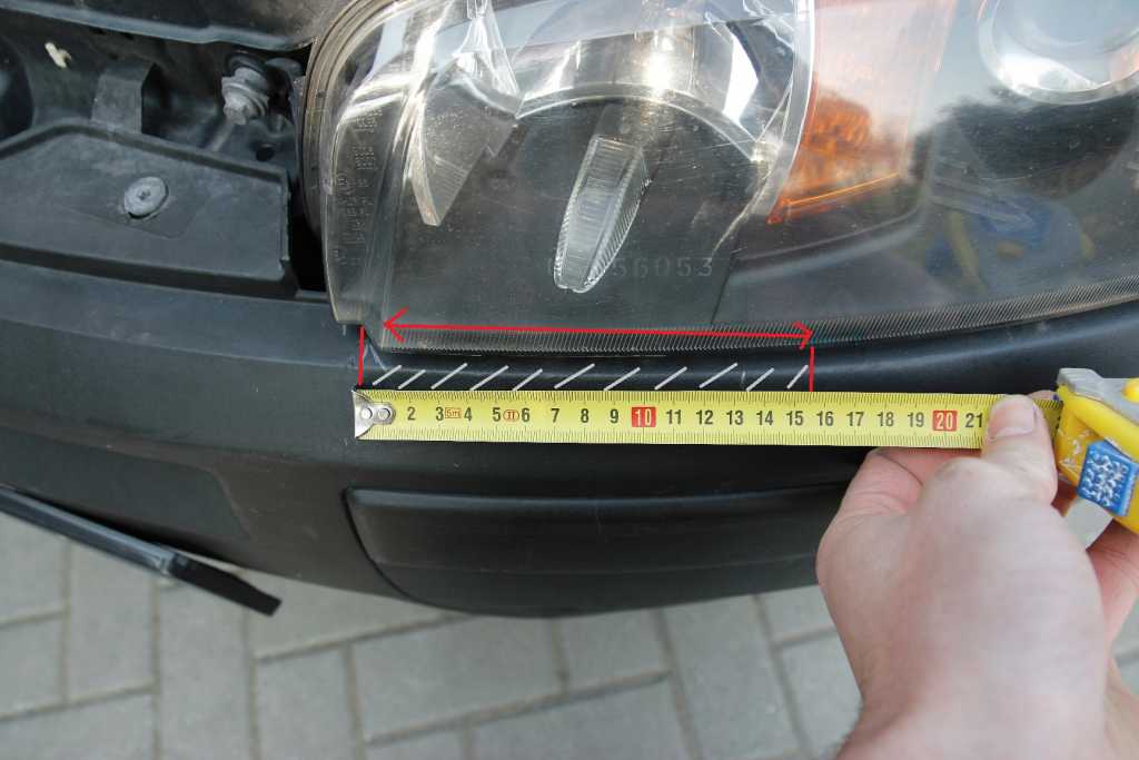 Wymierzyłem, że należy wyciąć 15,5 cm by lampy całkowicie schowały się w zderzaku. Załącznik: