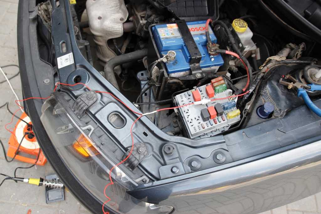 Instalacja elektryczna. Jako, że owe lampy posiadają logiczny automat włączania i wyłączania się przy światłach mijania, sprawa była uproszczona. Trzeci przewód, należało doprowadzić do przewodu (+) od lampy światła mijania (szaro żółty przewód). O tym będzie dalej. Na razie podłączenie zasilania. Załącznik: