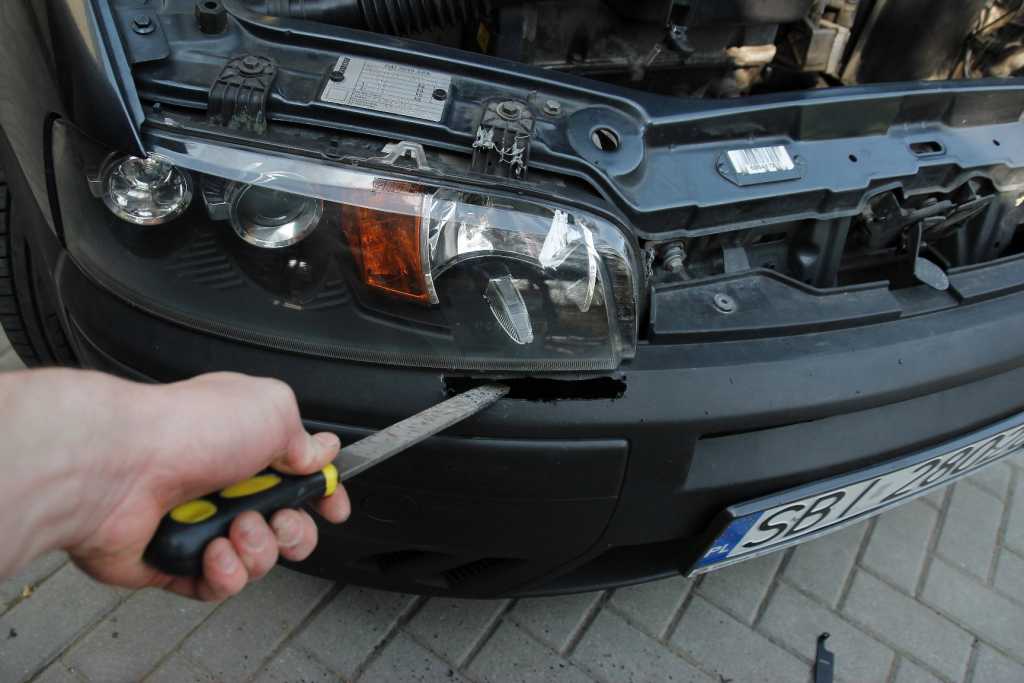 Wiercenie i dziurawienie zderzaka. Bałem się co z tego będzie. Ryzyk fizyk  . W odmierzone odległości i wyznaczone kropki wierciłem dziurki. Wiertarka stała się frezarką. Załącznik:
