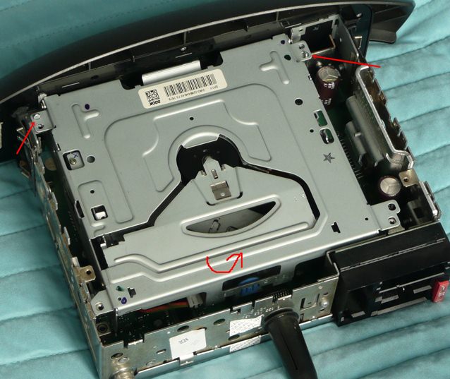 Po zdjęciu górnej obudowy ostrożnie dźwigamy wkład CD od tylnej strony wyczepiając przednie zaczepy, unosimy lekko wsad CD ponieważ od spodu jest tasiemka.