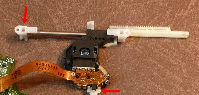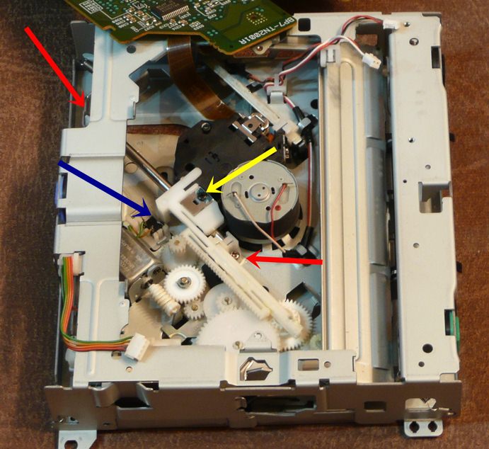 Dostaliśmy się do lasera, patrzymy w miejsce małego switcha zaznaczone na kolor niebieski aby przy montażu nowego lasera ten biały plastik go wciskał, ale tym czasem odkręcamy 2 śrubki zaznaczone na czerwono i wyjmujemy laser z mechanizmem.