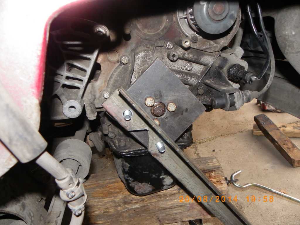 Następnie należy podstawić podpórkę pod silnik, ponieważ musimy wymontować mocowanie silnika do nadwozia.