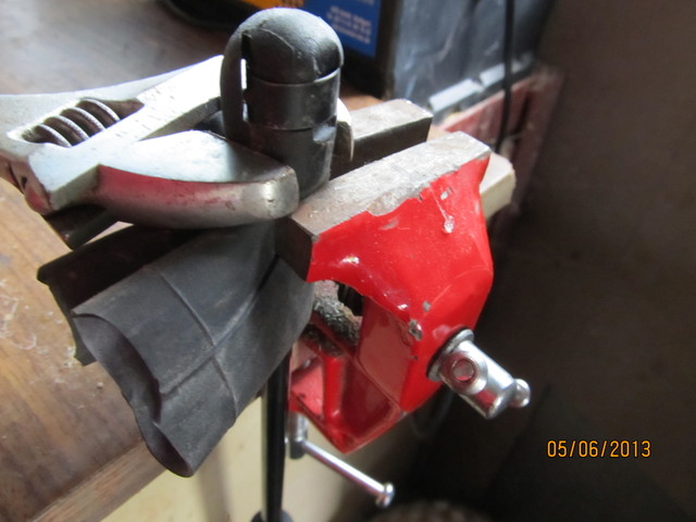 Siłownik owijamy np. w gumę (ja użyłem dętki od roweru) i mocujemy w imadło. Nie dokręcajcie za mocno żeby nie uszkodzić siłownika.Złapcie jak najbliżej główki bo w razie zgięcia tłoczyska ta część nie chowa się i nie rozszczelnimy siłownika. Kluczem odkręcamy główkę Załącznik: