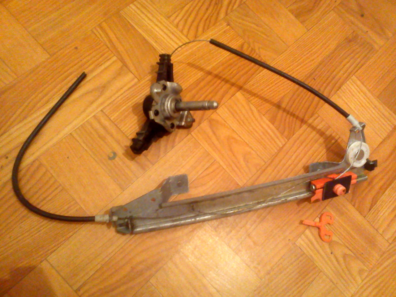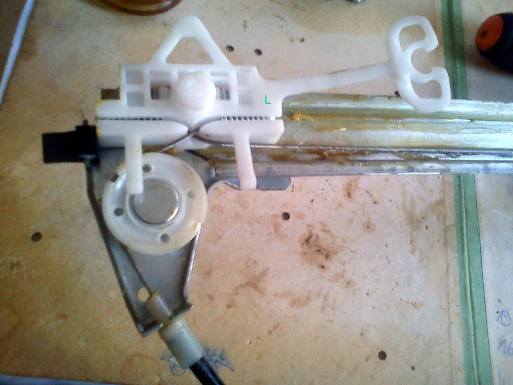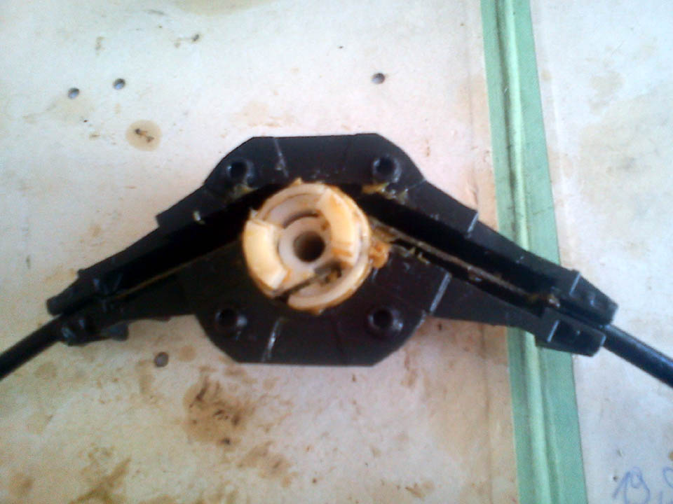 Przykład na fotografii, o ile "za krótka" ma się wydawać jedna z linek przy składaniu mechanizmu. Tutaj na stronie prawej najpierw montuje się dłuższą (dolną) linkę (pozycja "szyba otwarta"), a później dopasowuje drugą (tylko jak poprzednio, pancerz łatwiej jest najpierw umieścić w obudowie korby - czyli