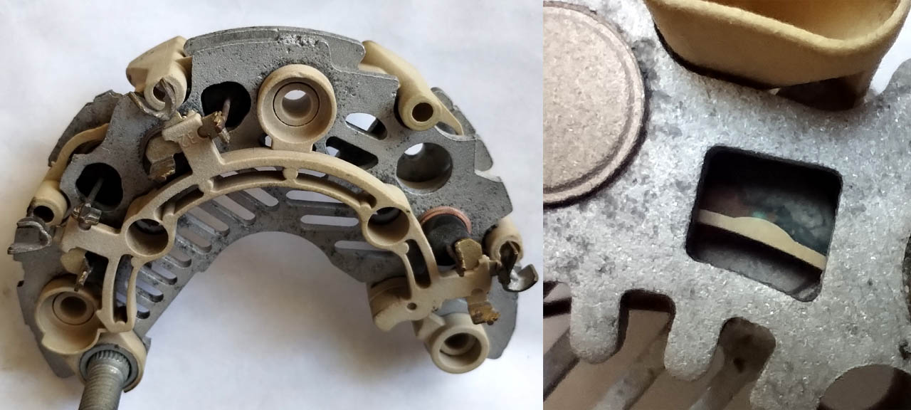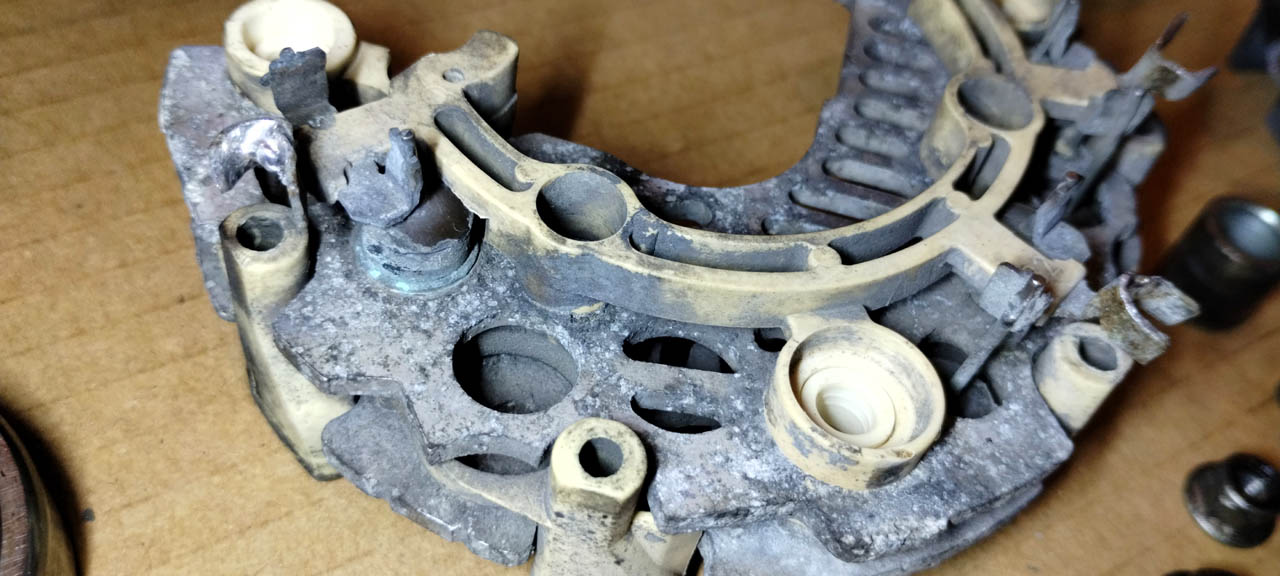 nieprawidłowe odpływy wody z podszybia były, lało na alternator kiedyś) narobiła zniszczeń w strukturze odlewów. Pęknięta pokrywka w dotyku jest jak papierek, wafelek, skorupka od jajka. Słabe, lekkie, kruche. Naprawa tego (lub wymiana) plus ewentualnie mostek (też korozja pogryzła), regulator, łożyska, może sprawić, że taka naprawa będzie nieopłacalna. Jedynie jako hobby, czy w ramach ćwiczeń.