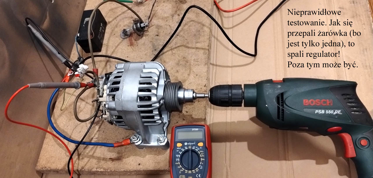 Testy alternatora. W domowych warunkach słabo to wygląda, trzeba by zbudować stanowisko, z napędem, z regulowanym obciążeniem itp., itd. Ale wiertarka też da radę. Obowiązkowo musi być jakiś akumulator oraz obciążenie. Użycie jednej żarówki to proszenie się o kłopoty. Jak się spali to może wziąć ze sobą regulator. W trakcie "testów" modyfikowanego ST-Denso, spaliła się żarówka H4 (albo regulator ją spalił, tego się nie dowiemy - na wszelki wypadek, modyfikacji NIE polecam). Dostał zwarcia na sterowaniu wirnikiem (idzie 100% ciągle). Także uważać. Jak żarówki, to musi być kilka na raz. Połączenia pewne, oczka, nie "na skrętkę", czy krokodylki.