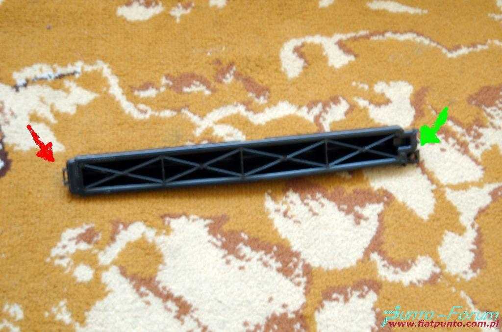 Czarną zaślepkę filtra odczepić w dolnej częsci (zdjęcie 5), wysunąć ok 2cm, podnieść do góry aby odczepić z górnego zaczepu (zdjęcie "6"). Wyjąć zaślepkę. Mocowanie dolne-zdjęcie 7. Mocowanie górne- zdjęcie "8") Wyjąć filtr, odkurzyć ssawką szczelinową pozostałosci liści, (Zdezynfekować parownik-znajduję się zaraz za filtrem. Można też wyczyścić z drugiej strony po zdjęciu przewodu odprowadzającego wodę-(zdjęcie "10"). Nowy Filtr najlepiej zwinąć w kształt litery "U". Wsunąć od spodu i wpychać po kawałeczku raz u góry raz u dołu. Strzałka na filtrze powinna wskazywać przepływ od przodu w kierunku tyłu samochodu.