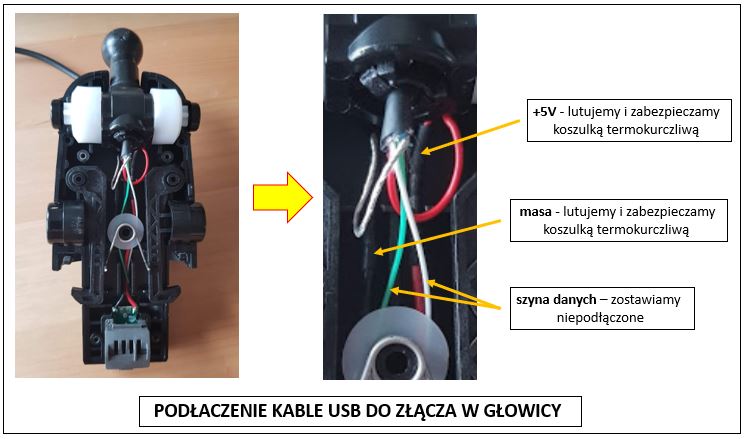 Przewód USB i kable w uchwycie lutujemy ze sobą. Czerwony z czerwonym i czarny z czarnym (lub ekranem w kablu trzy żyłowym). Biały i zielony zostawiamy.