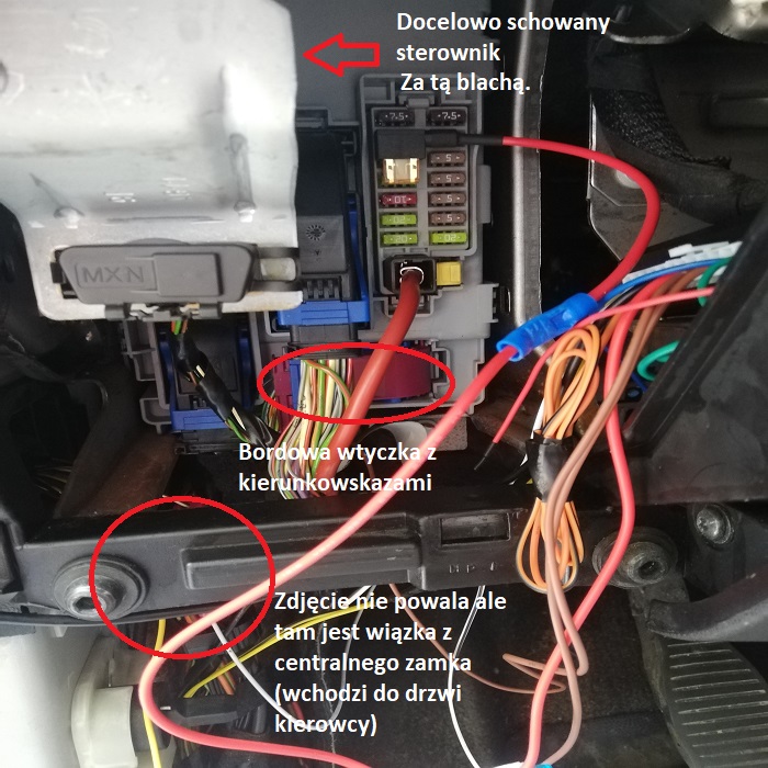 INFO. Jeśli chcemy mieć pewność odnośnie prawidłowości zlokalizowanych kabli (głownie CZ i klapy), przy zamkniętych wszystkich drzwiach, delikatnie "nakuwałem" kabelki sondą z mojego miernika a drugi koniec był wpięty do masy. Przy nakłuciu purpurowo-białego powinno otworzyć drzwi, przy purpurowo-czerwonym powinno zamknąć drzwi i z panelu środkowego nawet przy odpiętej tam wtyczce powinno otworzyć klapę.