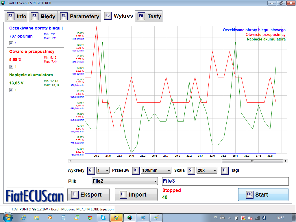 Zaklikaj w MES'ie w testach kąt otwarcia przepustnicy, procent wciśnięcia pedału gazu, czy jak to się tam nazywa, obroty, i może napięcie ładowania. Pojeździj trochę, tak żeby ując ten moment kiedy świruje i zapodaj wykresy