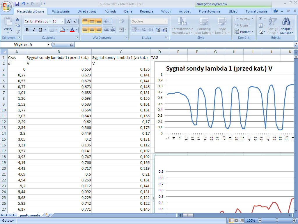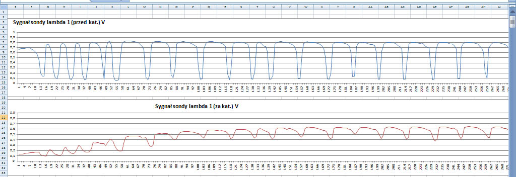 Wykres za katalizatorem po prostu "małpuje" pierwszą sondę, czyli katalizator nie działa (coś dopala, ale słabo)... Chyba, że jeszcze był za zimny (i/lub sonda ma uszkodzoną grzałkę - jeśli jest grzana w Punto_2).