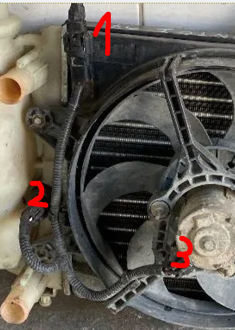 Komentarz do pliku: 1 - podłączenie do wiązki w sacmohodzie, 2 - czujnik w chłodnicy, 3 - wentylator