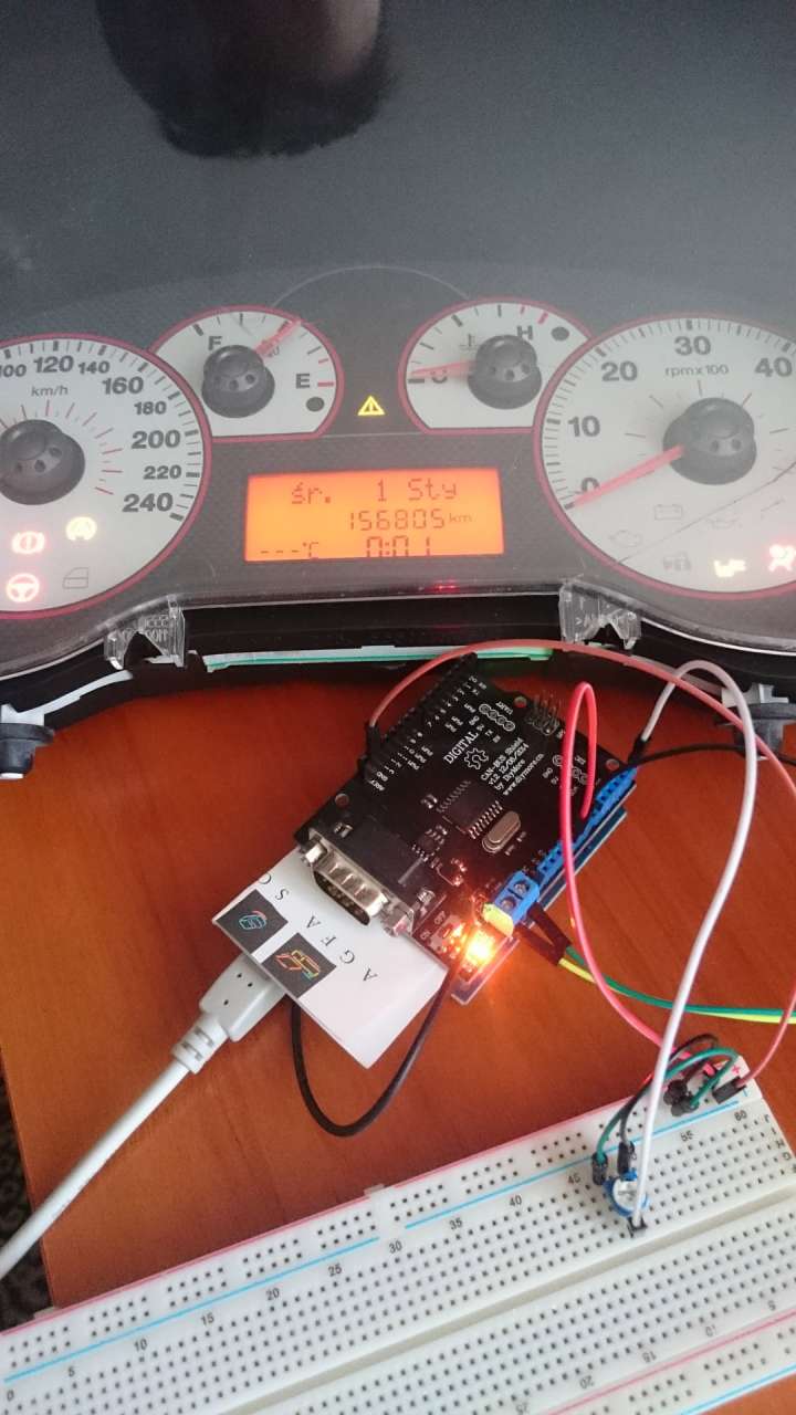 Co warto wiedziec a nie jest oczywiste a bez tego ani rusz: - zeby zlozone stanowisko dzialalo, konieczne jest wspolne uziemienie (GND) pomiedzy plytka CAN Shield a licznikiem - koniecznie trzeba pracowac na 50kbps baud rate (inne predkosci nie daja zadnego znaku zycia plytki, zadne diody kontrolne nie mrugaja) - trzeba rozkminic czy dany Shield ma/nie ma wbudowany rezystor 120ohm, w moim wypadku plytka go ma, ale mam wrazenie ze pola lutownicze ktora go lacza z obwodem sa puste i przygotowane do zlutowania, generalnie dziala (nie probowalem podpinac tego zestawu w aucie, wiec tam moze byc problem czy rezestyr ma byc w obwodzie czy nie, metoda prob i bledow dojde do tego w przyszlosci  ) - pin 0 licznika to GND - pin 1 to +12V na stale - pin 2 to +12V po zaplonie oba plusy musza byc podpiete (minus wspolny z minusem plytki shield, tak jak wspominalem wyzej) - pin 5 - linia Can-A - pin 6 - linia Can-B