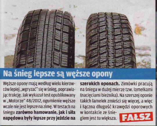 Ja tam mam taką regułę, a nie inną - nawet w rajdach stosowana opona ma mniejszą szerokość, żeby się przedrzeć przez kopny śnieg. Dawno takiej zimy nie było, ale gdyby tylko się pojawiły zaspy - docenię 165, bo łatwiej się zabiera z całym autem. Lód i błoto pośniegowe jest na tyle zdradliwe, iż i tak trzeba mieć szczególną ostrożność, wtedy większa szerokość może pomóc, ale dla mnie zimówka ma mieć większą użyteczność w zaspach - z racji tego, jakie mam drogi do miejsca zamieszkania