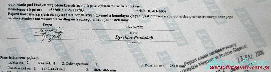 Mikimoto napisał(a): Synek, każdy dostaje wraz z dokumentacją "Wyciąg ze świadectwa homologacji". Gdzieś w połowie dokumentu jest podane: Turyn i data a obok podpis jakiegos dyrektora produkcji. Pozdrawiam