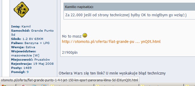 kris84 napisał(a): Kamillo napisał(a): Za 22.000 jeśli od strony technicznej byłby OK to mógłbym go wziąć:) No to masz http://otomoto.pl/oferta/fiat-grande-pu ... ynQ0t.html21900pln Otwiera Wars się ten link? U mnie wyskakuje błąd techniczny