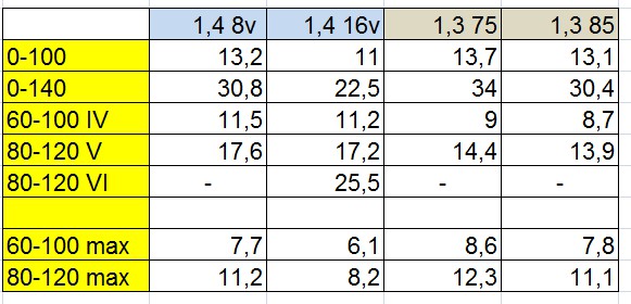 pozwoliłem sobie na przerysowanie wykresów momentów obrotowych silników 1,4 benzyna 8v i 16 v oraz diesli 75 i mocniejszego. osobiście wydaje mi się, że wartości momentu dla benzynówek ciut zaniżone dla niskich obrotów za ich poprawność nie odpowiadam, gdyż dane pobrałem z ciekawej stronki z dużą ilością danych http://www.automobile-catalog.com 1,4 16v to moc 105 kM tu dane przyspieszeń: Załącznik: