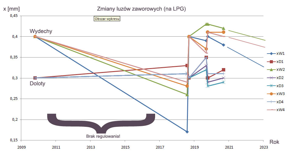 Ciekawostka odnośnie luzu W1 z roku 2018. Później (początek 2019) się okazało, że jest nieszczelny kolektor wydechowy właśnie na jedynce (zerwane i nieprawidłowo "naprawione" szpilki). Musi być tu związek (bo jakie jest inne wytłumaczenie, że jeden luz tak nagle spadł - a później się cudownie uspokoił po naprawie wydechu?). Zamiany miejscami wtryskiwaczy LPG nic tu raczej nie dały (ani lepiej, ani gorzej nie jest). Mając dane historyczne można się pobawić w przewidywanie przyszłości, np. kiedy może się trafić remont. Zakładając naiwnie, że silnik wytrzyma do minimalnej dostępnej grubości płytek, to jeszcze kilka lat (lub przebieg 150000-200000 km). Załącznik: