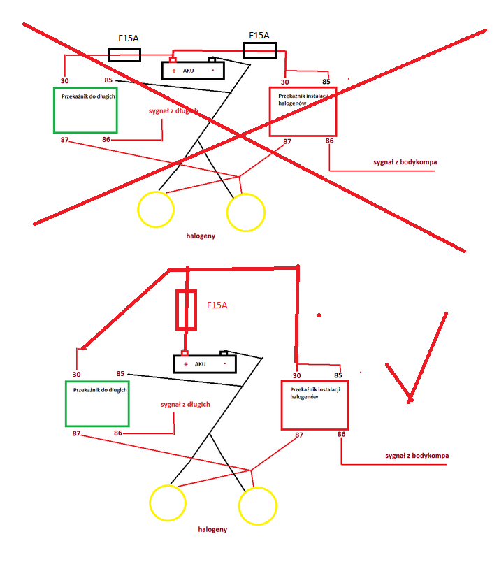 Breyton napisał(a): Mniej więcej tak to miałoby wyglądać jak przedstawiono na profesjonalnym rysunku technicznym To jest dobry rysunek jak sfajczyć fure [ Dodano: 24 Lut 2013 00:55 ]Breyton napisał(a): U mnie będą halogeny w zderzaku. Chcę podłączyć je dodatkowo pod światła długie. Jak będę włączał długie lub mrugał to halogeny też się zaświecą. Przeglądu nie przejdzie [ Dodano: 24 Lut 2013 00:58 ]teraz lepiej  Załącznik: