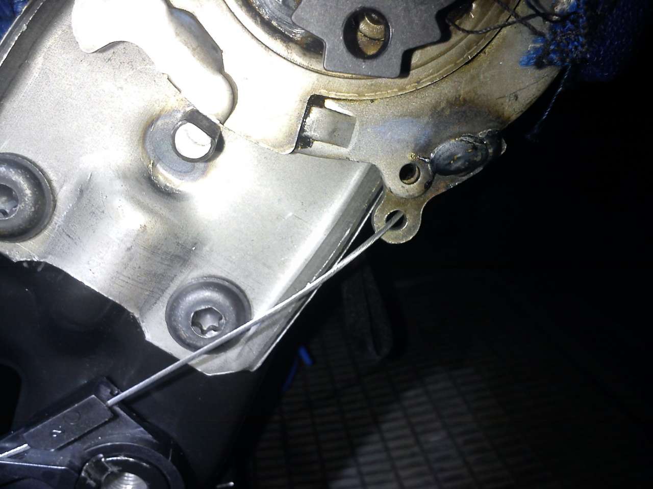 Po zdjęciu osłony, całość wygląda mniej więcej tak jak poniższych zdjęciach. Zaznaczam, iż drut połączyłem w sposób roboczy i nie wiem jak powinien przejść w okolicy mocowania zaczepu pasa bezpieczeństwa (czy nad, czy też pod, czy też inaczej obrócić ale o tym za chwilę).