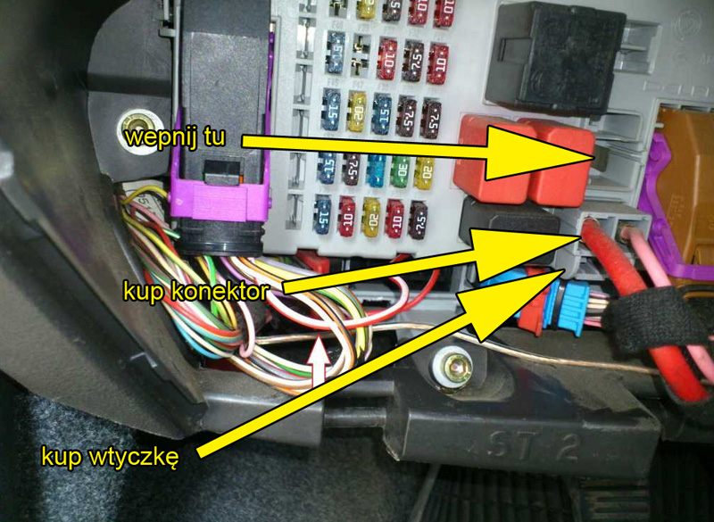 domin45670 napisał(a): Zrób duplikat wtyczki, którą widać na zdjęciu. Wystarczy sama wtyczka + 1 konektor. Całość wpinamy do wolnego gniazda znajdującego się powyżej (trzeba będzie zeszlifować jeden podłużny profil, żeby wtyczka weszła (2 minuty roboty) - można też zdrapać np. nożykiem). Numery części znajdziesz w moim manualu (str. 4) Cytuj: (dostępne we Fiacie: 10149786 (kostka), 19206094 (konektorek - 1szt.) - łączny koszt to ok. 24zł), majkel_94 napisał(a): wariant ekonomiczny, więc wtyczki i innych do skrzynki bezpieczników za 25zł nie kupię  Wiem że tak najprościej i elegancko, ale wolę taką oprawkę na kablu bo za 5zł na allegro  Myślałem że w elektrycznym to dostane ale to na samochodowy bezpiecznik potrzeba i w jakimś motoryzacyjnym może dorwe