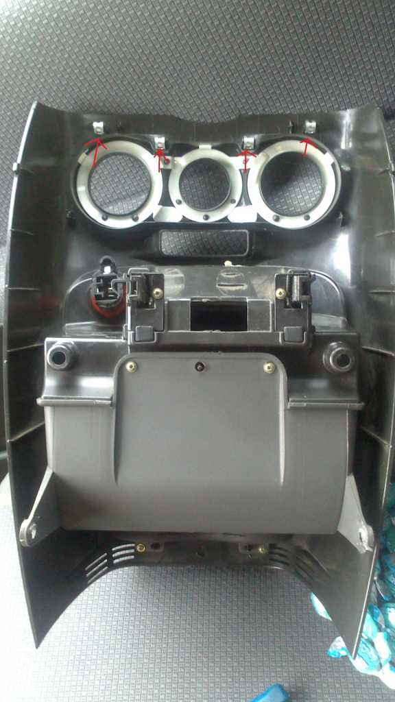 Po zdjęciu środkowej konsoli, warto się upewnić, czy 4 blaszki ją trzymające są na swoim miejscu i czy dobrze się trzymają. U mnie jedna odleciała i trochę zajęło, zanim się ją udało znaleźć. Ją i jeszcze jedną nieco dogiąłem (te wewnętrzne blaszki), aby lepiej trzymały tych plastikowych uchwytów.