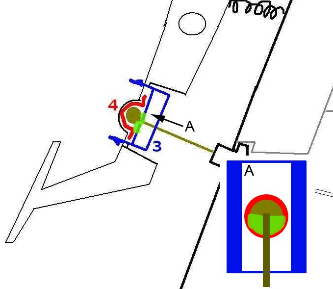 W lecie siknąłem w poniższe miejsce smarem (olejem) do łańcucha rowerowego. Od tak na szybko przed urlopem. Na jakiś czas to pomogło (niespełna 1000 km). Dziś zauważyłem, że nie ma konieczności ściągania tego plastikowego elementu (kolor niebieski) aby się dobrać do miejsca styku białej miseczki z kulowym zakończeniem siłownika sprzęgła. Postanowiłem więc to miejsce potraktować smarem litenowym naniesionym pędzlem. Fakt, że wykonana praca jest bardzo prowizoryczna (bez demontażu całości), ale wydaje mi się, że skoro już po trzecim naciśnięciu pedału sprzęgła była cisza, to problem nie leży głęboko ale jest na wierzchu. Dostęp i tak jest fatalny. Zobaczymy na ile to wystarczy. Na zielono oznaczyłem miejsce, które pomazałem smarem nałożonym pędzlem. A - widok od strony siłownika. Załącznik:
