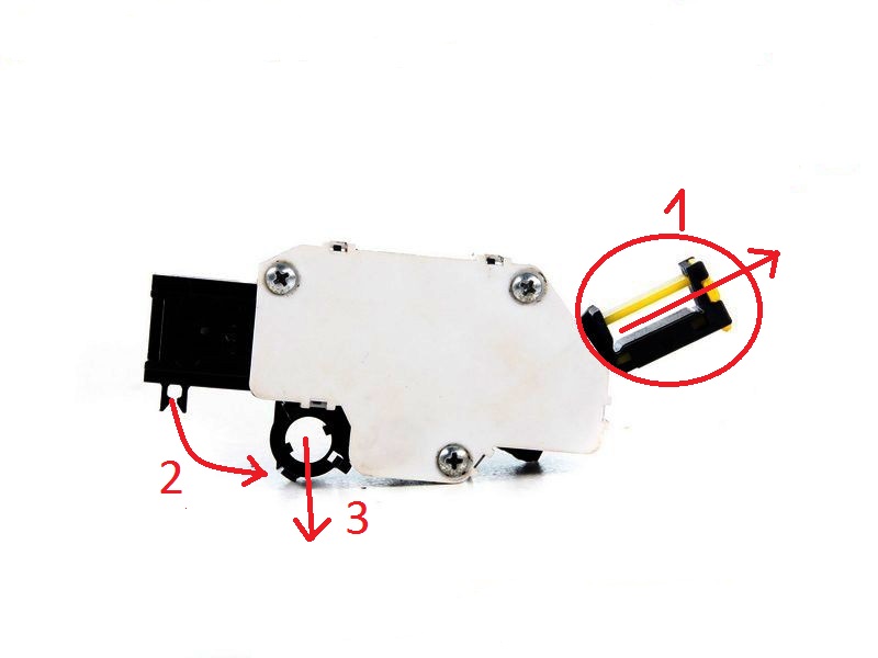 Tak wygląda czujnik w naszych kropkach. Najpierw musisz odpiąć tą zapinkę z prawej strony (1 - wysuwasz ją), potem na dole jest taka wajcha która blokuje trzpień (na zdjęciu jej nie ma nr 2) i wysuwasz ją prostopadle do czujnika. Odkręcasz 3 widoczne śruby, odpinasz (DELIKATNIE - łatwo je ułamać) zatrzaski i masz dostęp do środka. Aaaa! I najważniejsze! Uważaj, żeby nie złamać bolca który jest blokowany przez zapinkę nr 1. Wygląda na dosyć kruchy (nie wiem jaki idiota wymyślił coś takiego w takim miejscu) bo smutna godzina jak się złamie... A reszta tak jak pisałem wcześniej...