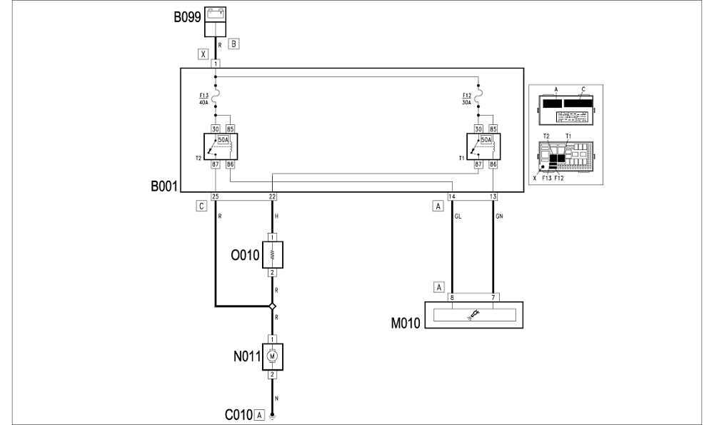 Jeżeli płyn chłodzący silnik osiągnie określony poziom temperatury, centralka M10 przesyła sygnał - ze styku 7 konektora A który wzbudza przekaźnik 1 prędkości elektrowentyltora T1 , który następnie przesyła zasilanie do elektrowentyltora N11 poprzez opornik dodatkowy 010: wentylator kręci się tak pierwszą prędkością (wolno).