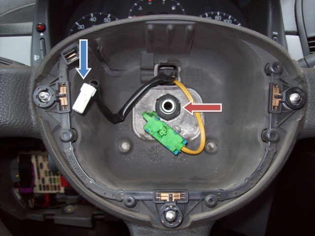 6. Odpinamy białą wtyczkę od klaksonu (niebieska strzałka na zdjęciu poniżej).