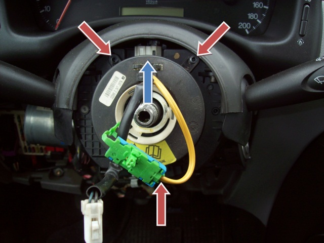 5. Odkręcamy 3 śrubki z tyłu kierownicy (imbus nr 5), odpinamy złącze i wyciągamy poduszkę.