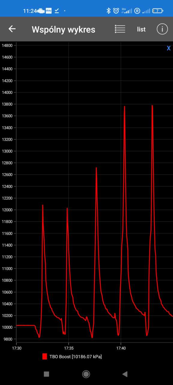 Więc tak, nie wrzucę logow - byłem u elektromechanika i ten przejechał się tylko ze mną - nie mial czasu bo "dzieci". Za to nie wziął pieniędzy. Turbo gdy miało wymagane 1,75 dmuchalo 1,25. I więcej niż 1.25 nie potrafiło wysrać (Odejmujac cisnienie atmosferyczne daje to słabe 0.25 bara). Ciśnienie w kolektorze tak jak boost, max 1.25 bara (tu już wartość bezwzględna). Turbo kaputt?