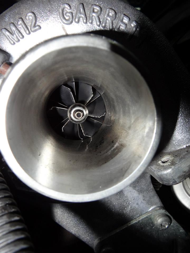 Jachaś napisał(a): Jeżeli wszystkie podciśnienia od sterowania turbo są ok (i pompa vaccum też jest ok) Nadciśnienia  Garrett GT12/14; wszystkie IHI z Tjetów są sterowane nadciśnieniem. Na wylocie z turbo (po stronie gdzie jest ciśnienie podniesione) idzie wężyk do elektrozaworu regulującego ciśnienie i z zaworu weżyk do "gruszki", której pozycja domyślna to zamknięty westgate -> czyli z punktu widzenia turbosprężarki max wydajność. Uszkodzenie tego raczej skutkuje przeładowaniem... a przed tym silnik broni się innymi metodami (ZAPEWNE takimi jak upuszczenie DV czy przymknięcie przepustnicy). T-jet nie ma pompy próżniowej. Multiair ma, T-jet nie. Podciśnienie do serwa jest brane z kolektora i do niczego innego nie jest wykorzystywane. W MA tez turbo jest sterowane nadciśnieniem. Podciśnienie z pompy jest brane tylko do serwa Także układ sterowania turbo skreśliłbym na wstępie, bo zapewne auto by jechało, tylko na pełnym ogniu by szarpało (działanie DV) i w końcu by przeszło w tryb awaryjny 20 koni mechanicznych i 80km/h vmax --------------- Trzeba sprawdzić samo turbo (w szczególności zajrzeć jak wygląda wirnik sprężarki - czy np. nie było ataku much kamikadze w kaskach i wirnika już nie ma  ) Jak jest i wygląda ok, kręci się, nie ma dużego luzu to raczej turbo jest ok. Turbo po ataku much: Załącznik: