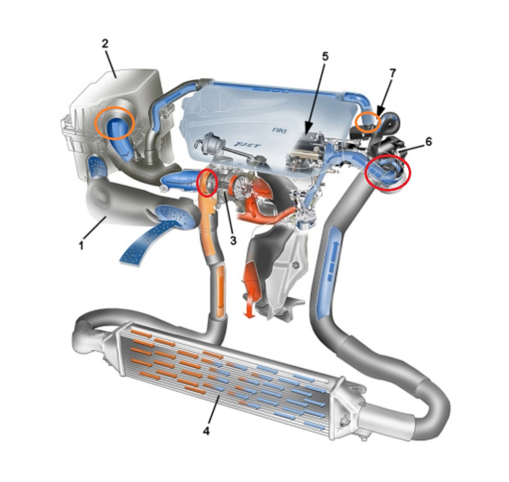 Na czerwono zaznaczyłem miejsca o których mówił ipIV (czyli turbo-przepustnica), czyli wypinasz przy turbo (3) i przy przepustnicy (6). Jeżeli masz kompresor i jakiś reduktor (żeby ustawić stałe 2 bary) to możesz nie wypinać węża przy przepustnicy (wtedy sprawdzisz też kolektor). Na pomarańczowo zaznaczyłem miejsca które są do odpięcia jak byś miał reduktor i chciałbyś sprawdzić cały układ dolotowy na szczelność, wtedy wypinasz węża od puchy filtra (2) rurkę i ten wężyk co idzie do (7) i zaślepiasz go z obu stron. I wtedy możesz przy ciśnieniu około 0.7-0.9bara sprawdzić cały układ dolotowy. Chociaż z tą (7) to pewny nie jestem bo nie wygląda mi to na odmę (a odmę trzeba odłączyć i zaślepić to takiego "pełnego" sprawdzenia szczelności)