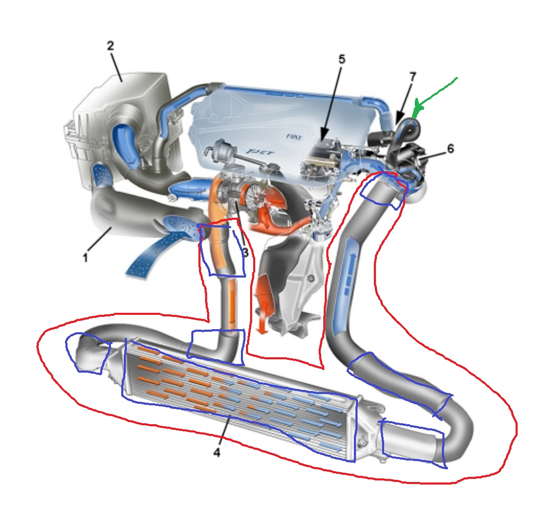Generalnie j/w W Tjecie będzie jeszcze przeszkadzać wąż z zaworu upustowego DV (zielona strzałka) - trzeba odłączyć i jakoś zaślepić. DV w stanie beznapięciowym puszcza wszystko (przynajmniej w MA), także raczej wąż trzeba moooocną folią zaślepić Najbardziej podejrzane niebieskie elementy - złączki-rurki gumowe i intercooler. Ma być szczelnie od turbo do przepustnicy (czerwony). Załącznik: